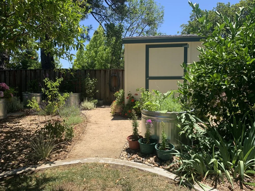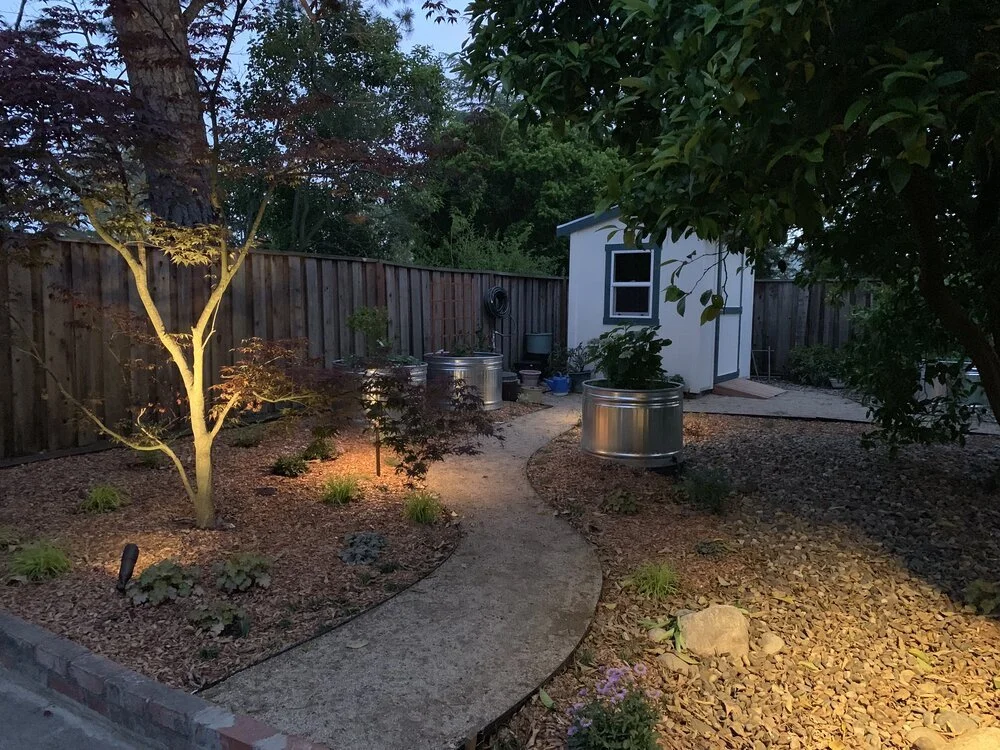This landscape project transforms a backyard into a safe, functional, and beautiful space designed for aging in place. The design centers around accessible trough-style raised planters at comfortable heights for easy edible gardening without bending, filled with vegetables, herbs, and compact fruit trees to promote healthy eating and gentle activity. A spacious new shed provides ample storage for gardening tools and outdoor equipment, reducing clutter and minimizing trip hazards, while strategic lighting throughout the yard illuminates pathways, seating areas, and garden features to ensure safety during evening hours, with motion-activated lights near the house for additional security.
