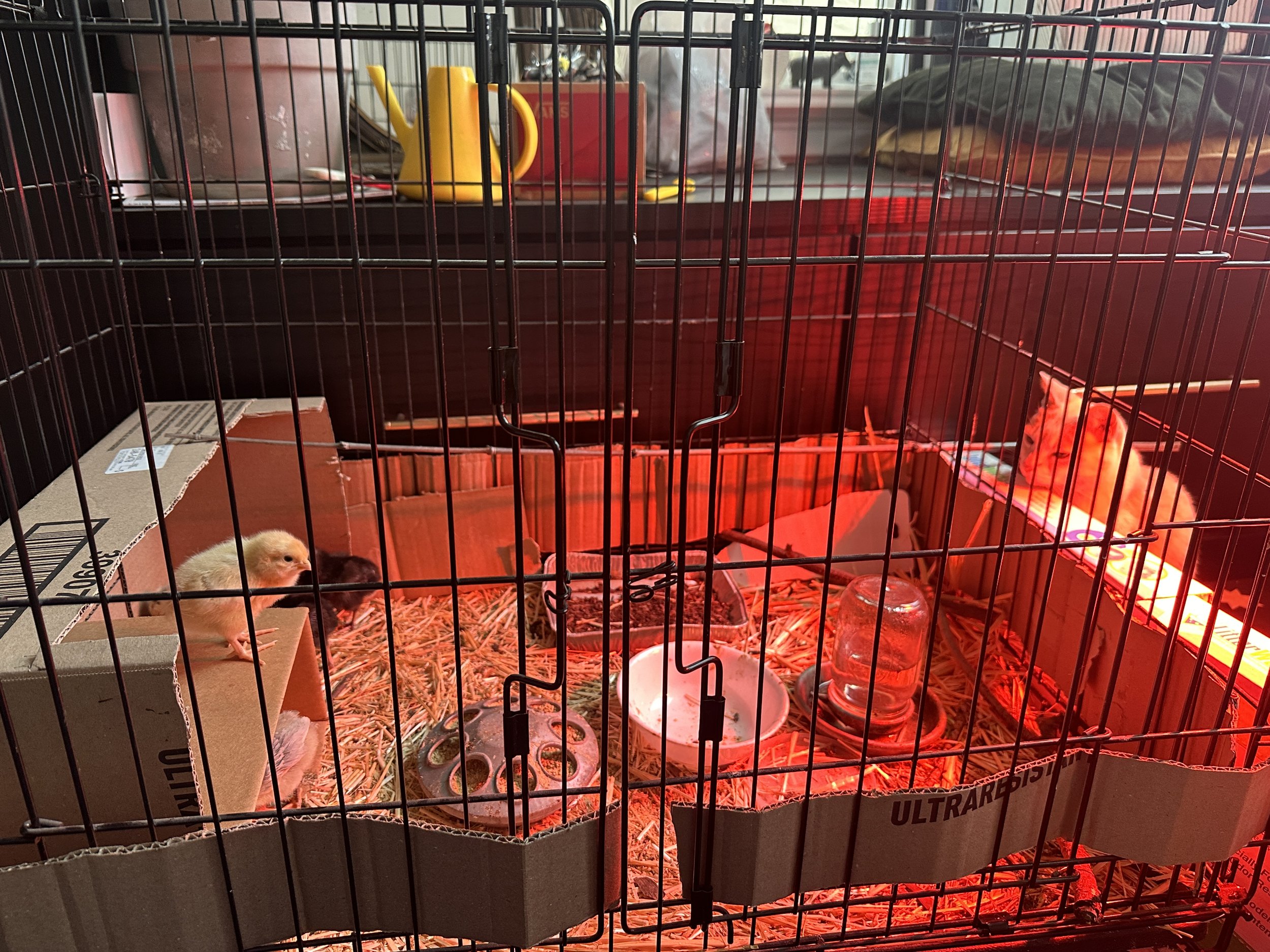 They lived in a box for a few days until I realized that I would need somewhere larger to stash these chicks. I went to Urban Ore and bought what I thought was a dog crate. However, when I got the thing home I realized it was a 2-story cat condo. No problem — it was bigger than I needed and a bit unwieldy, but it worked. Oh, except the chicks were so small they could just pop out between the bars. smdh